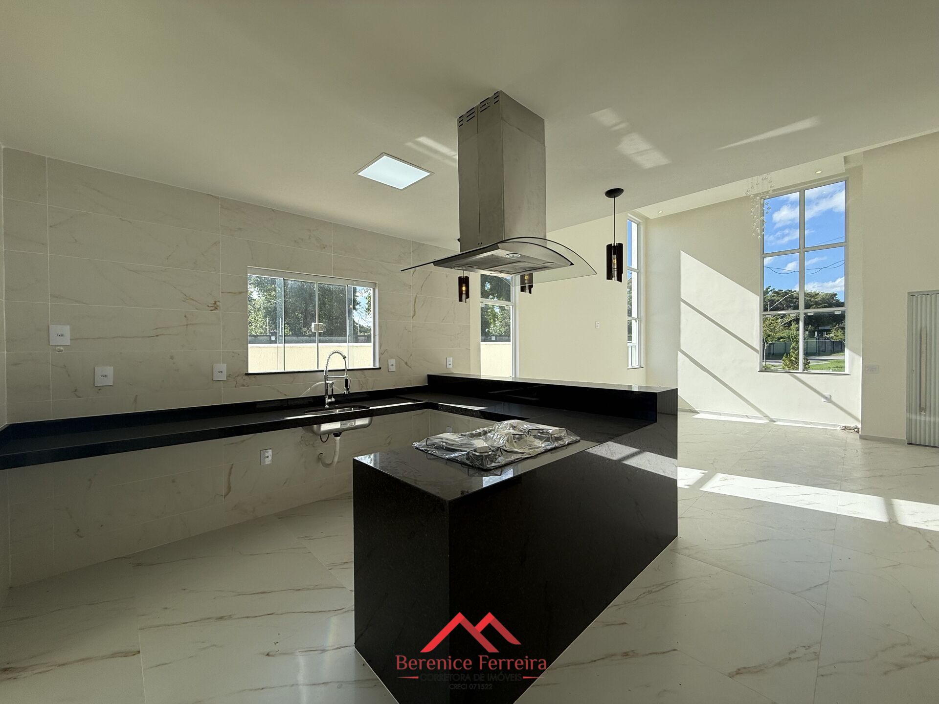 A cozinha em conceito americano é moderna e funcional, equipada com bancada, cooktop e coifa, integrando-se perfeitamente à área gourmet. O espaço conta ainda com porta em blindex, proporcionando praticidade e integração dos ambientes.